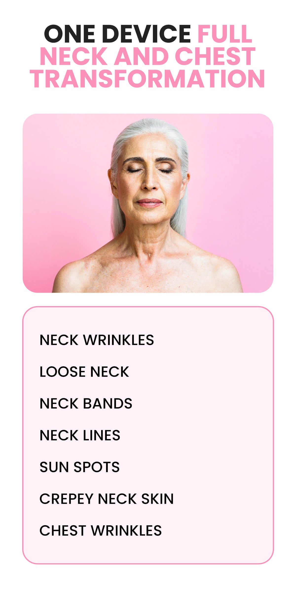Loose, sagging skin appears noticeably lifted and toned. The neckline looks sculpted and rejuvenated as if years have melted away. Sunspots and uneven pigmentation soften, replaced by a radiant, healthy glow.