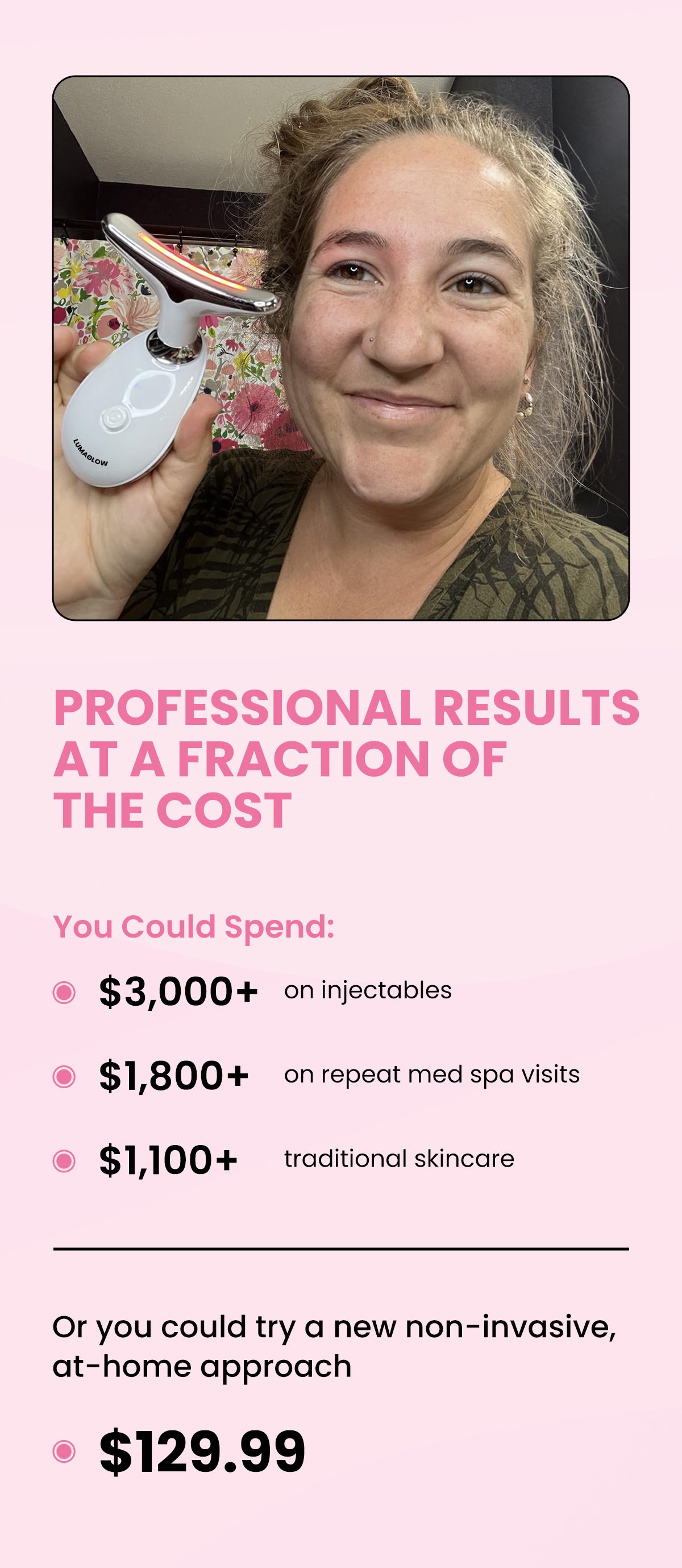 The LumaGlow offers substantial long-term savings compared to regular visits to your treatment center. You'll have unlimited access to professional-grade treatments at home or anywhere you travel for a fraction of the price.