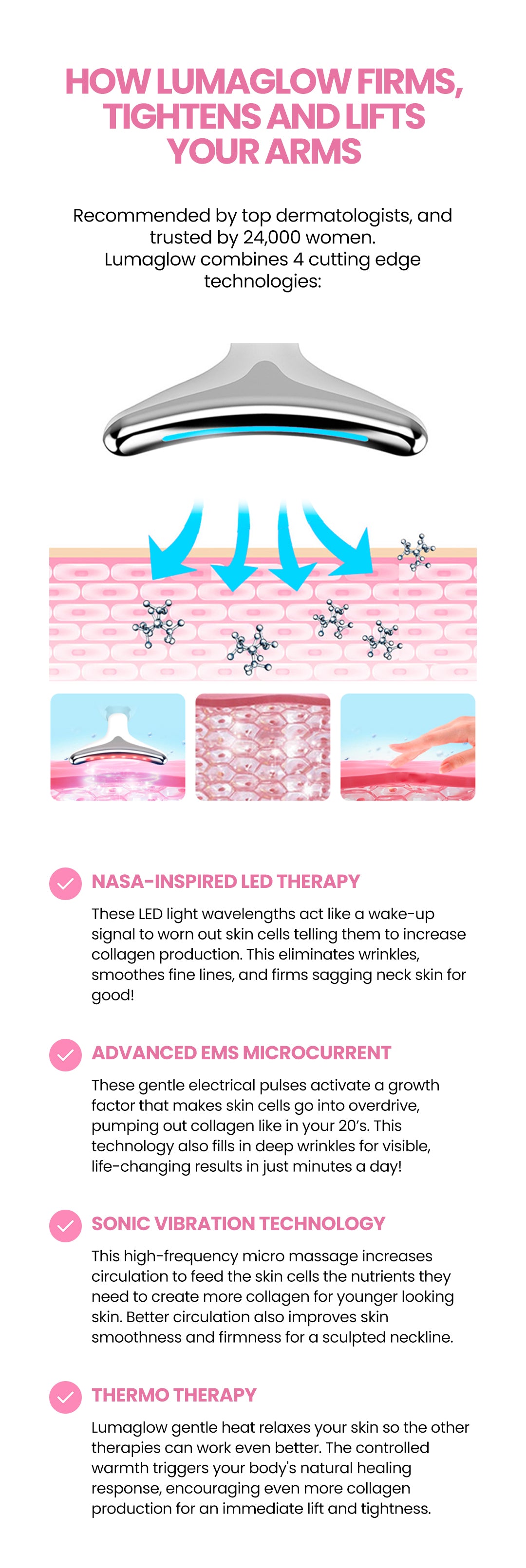 Your skin begins responding to LumaGlow’s red light and microcurrent energy. You’ll notice a gentle warmth and increased circulation early signs that collagen and elastin are being reactivated. Your arms may start to feel smoother & firmer after each session.